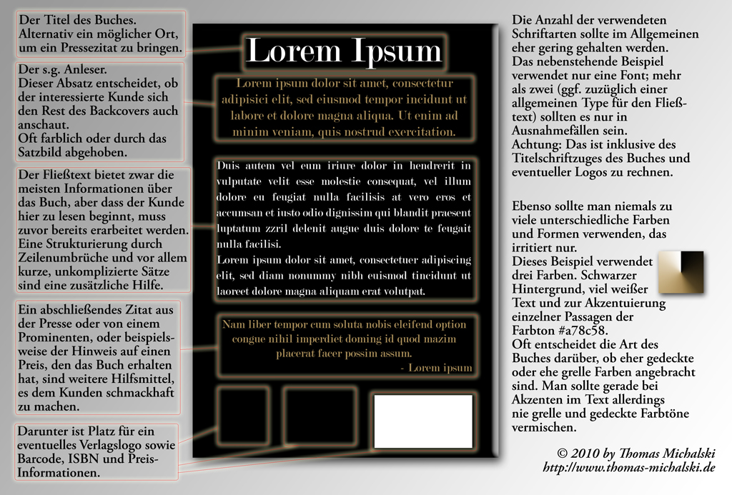 Ich habe ein ganzes Regalfach mit Büchern über das Schreiben – keines geht auf auf die Rückseite der Bücher ein. Ich habe keine zu kleine Sammlung von Büchern zum Thema Layout, aber auch dort findet man kaum etwas. Es gibt Bücher zu Cover-Gestaltung, es gibt Webseiten zu diesem Thema – aber niemand schätzt das Backcover.