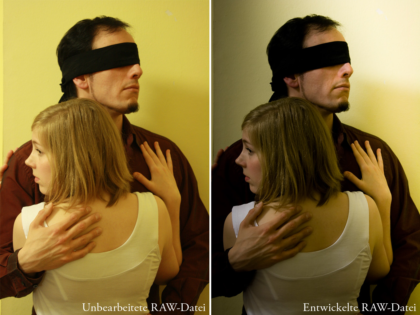 In diesem Falle habe ich mir Ben (ja, der gleiche wie oben) und Miriam geschnappt und sie vor eine einfarbige Säule postiert, die Regisseurin sehr zu ihrer Freude diese Augenbinde wickeln lassen und dann einen entsprechenden Satz Fotos gemacht.