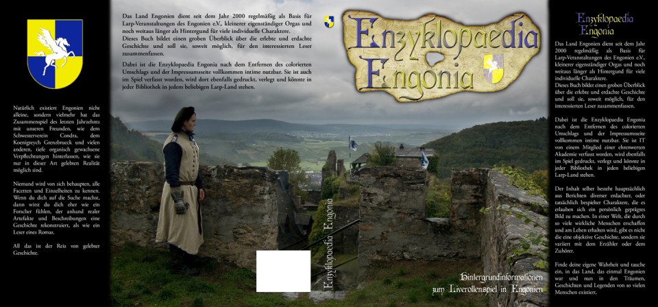 Anbei zu diesem Beitrag ist der Schutzumschlag eines Enzyklopaedia Engonia genannten Buches. Basierend auf einem Foto von Oliver Schmidt habe ich die Einbandgestaltung für den Herausgeber des Buches, Tobias Cronert, übernommen. Das Buch sammelt und bündelt den Hintergrund des fiktiven Reiches Engonien, dass auf viele Jahre aktiv bespielter Geschichte zurückblickt und das hier nun auch über Vereinsgrenzen hinaus vorgestellt wird.