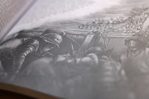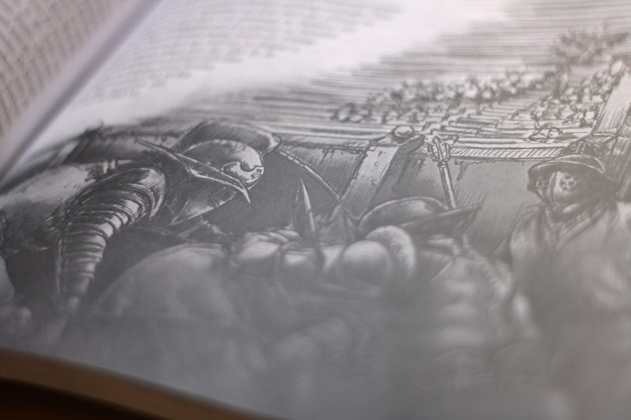 Und was soll ich sagen? Es sieht ziemlich phantastisch aus. Es ist ein Softcover im Format A4, innen wie außen illustriert und gesetzt von Patrick Soeder, der einen ziemlich guten Job hingelegt hat. Die Bandbreite der Illustrationen ist recht groß, was an dem langen Produktionslauf des Buches liegen dürfte, aber mir gefällt, was man in dem Buch zu sehen kriegt. Auch das Problem der schlechten Lesbarkeit ob dunkler Untergründe, das frühere Bände des Verlages geplagt hat, ist nicht mehr.