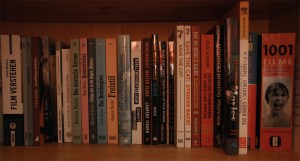 Ein Teil meiner Film-Theorie-Literatur; gut erkennt man die unterschiedliche Textausrichtung auf deutschen und englischen Buchrücken