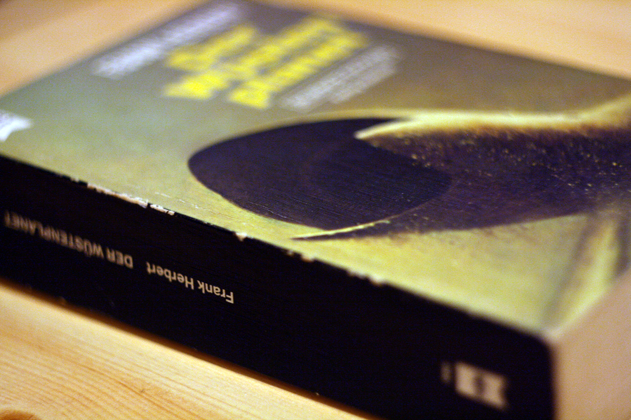 Was uns zu dem nebenstehenden Bild bringt, meiner deutschen „Der Wüstenplanet“-Ausgabe nämlich. Das Problem wird sofort sichtbar – wobei man auch gelegentlich liest, dieser „Bug“ sei ein „Feature“, weil es dazu führe, dass egal wie das Buch liegt, immer eine der beiden Informationsflächen lesbar sei, entweder das Cover oder der Buchrücken. Denn nicht auf jedem Backcover steht drauf, was für ein Buch es ist.