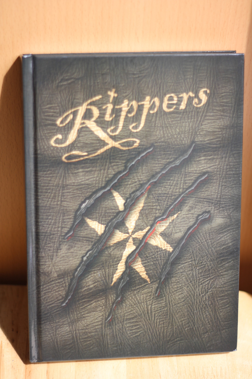 Noch ein Belegexemplar. Rippers, auf dem Buchrücken weiter ausgeführt als Horrorrollenspiel in der viktorianischen Zeit, ist ein wuchtiges Hardcover im überaus attraktiven, kleineren Format, dass man schon vom Grundregelwerk von Savage Worlds her kennt – denn genau für das Spiel ist das Quellenbuch geschrieben.