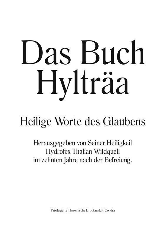 Ich habe bei dem Design versucht, möglichst stark den Eindruck eines heiligen Buches zu vermitteln, ohne „eine Bibel“ zu konstruieren. Ich denke, das ist auf jeden Fall gelungen. Jetzt stellt sich noch die Frage nach einem finalen Lektorat, da viele der wirklich lange schon im Verein verwandten Texte einen sehr, sagen wir, unterschiedlichen Sprachstand aufweisen, aber um die gesamte Problemstellung und die Frage, was davon realistisch bei diesem überraschend immensen Textkorpus letztlich geleistet werden kann, kümmere ich mich dann ein anderes Mal.