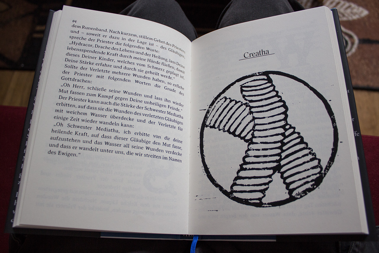 Dennoch ist die Begrifflichkeit wichtig. Wer sich aufmerksam mit Büchern auseinandersetzt, wird bemerkt haben, dass bei vielen Büchern die Kapitel, mindestens aber die Überkapitel stets auf der rechten Buchseite, also der recto-Seite, beginnen. Das nebenstehende Bild stammt aus dem Buch Hylträa, das ich für den Condra e.V. gesetzt habe; so wie ich generell dieses Mal Beispiele mehr oder weniger aus eigener oder nahestehender Produktion gewählt habe, alleine, wegen der rechtlichen Fragen.
