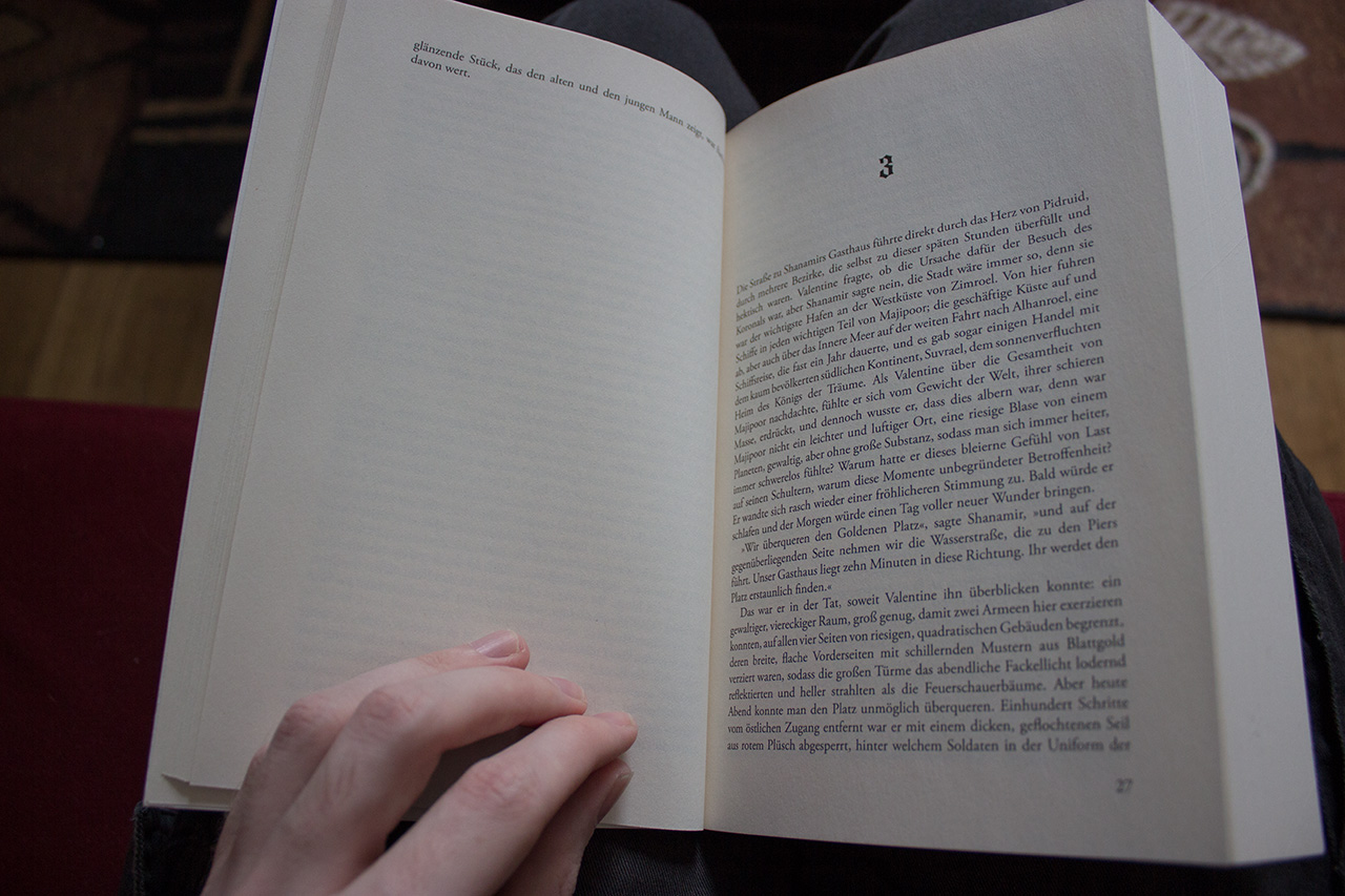 Es hat dabei einen Grund, dass das so gehandhabt wird. Wenn man umblättert, ergreift man ja die rechte Seite und schlägt diese nach links um. Das führt dazu, ganz notgedrungen, dass das, was zunächst „fest“ ist, was direkt ins Auge fällt, die rechte Seite ist, da die (zukünftige) Links sich ja noch in Bewegung befindet. Dadurch wird diese rechte Seite, oder vielmehr die recto-Seite gegenüber ihrem verso-Pendant ausdrucksstärker und fällt mehr ins Auge. Das nebenstehende Foto zeigt mich beim Blättern im beim Mantikore-Verlag erschienenen Lord Valentine von Robert Silverberg, rein als Beispiel.