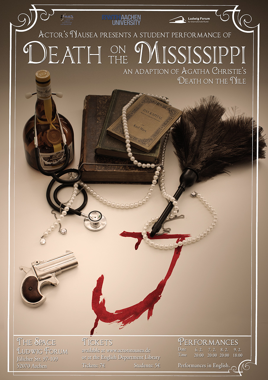 An diesem Wochenende, von Donnerstag bis Sonntag, spielen Actor’s Nausea wieder im Ludwig Forum hier in Aachen. Unter neuer Regie bringt das Ensemble Death on the Mississippi auf die Bühne, eine (ganz offensichtlich teils eher freie) Adaption von Agatha Christies „Tod auf dem Nil“.