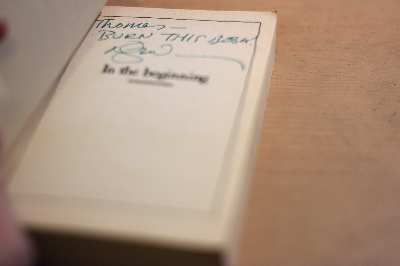 Wichtig ist, dass ich, als ich den Tisch erreichte und meine lädierte Fassung des Buches vor ihn legte, von Gaiman eine Queste erhielt. Er schrieb mir, wie allen, die mit diesem Buch zu ihm kamen, drei Worte hinein: „BURN THIS BOOK“. Und er sagte mir, dass dies eine Aufgabe an mich sei, denn dazu gäbe es eine Punchline, die ich mir bei Pratchett abholen müsse. Ich war überwältigt!