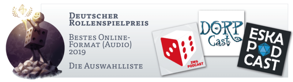Wir sind nominiert! Der DORPCast ist in der Kategorie Online-Formate: Audio auf der Shortlist des Deutschen Rollenspielpreises gelandet. Wir sind dort platziert gemeinsam mit den gleichsam großartigen 3W6 Podcast und Eskapodcast, und definitiv höchst erfreut darüber!