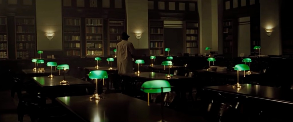 Natürlich ist der Film darin nicht komplett alleine; ich möchte gar nicht behaupten, Sieben wäre der einzige Film, der so etwas zeigt. Nicht ausnahmslos alle Filme nutzen Bibliotheken nur als pure Kulisse. Die Unbestechlichen hat eine der vielleicht ikonischsten Bibliotheksszenen der Filmgeschichte mit einer atemberaubenden letzten Aufnahme, aber es ist letztlich Archiv-Recherche inklusive eines Mitarbeiters, der ihnen die Sachen heraussucht. Die Neun Pforten zeigt Bibliotheksrecherche, aber dort ist sie Mittel zum Zweck (und Rahmen für eine unheimliche Begegnung), sie steht nicht derart im Rampenlich.