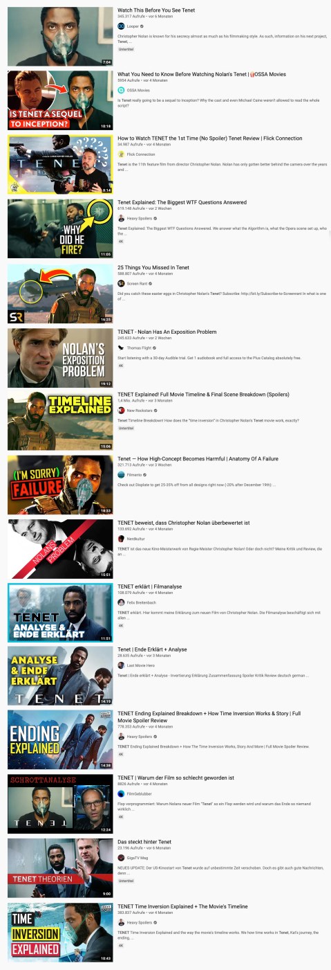 Schaut man nun also im Falle von Tenet mal nach, was andere Leute auf YouTube so zu dem Film zu sagen haben, stößt man auf eine ganze Kollektion an gleichartigen Videos. Manche titeln eine Version von „Das musst du wissen, bevor du den Film schaust“ … und das weckt ja schon meine Skepsis. Der Film beinhaltet meiner Meinung nach wirklich alle Informationen, die zum Verständnis nötig sind. Aber noch stärker explizites Vorwissen ist wirklich unnötig und ich fragte mich, ob die Nachfrage nach solchen Videos letztlich Ausdruck eines kollektiven Aufmerksamkeitsdefizits ist, geboren aus der verlorenen Fähigkeit, 100% fokussiert nur eine Sache zu tun, aber in das Horn mag ich heute nicht stoßen.