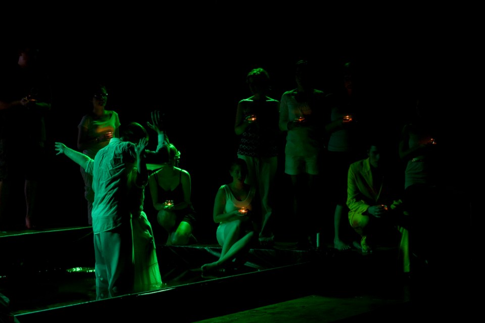 Und mehr als die meisten Bühnenstücke, die ich gesehen habe, war das wirklich eine allsinnliche Erfahrung. Die immense Luftfeuchtigkeit im Saal, der Geruch des Wassers, die kühle Brise, die eine an einer Stelle eingesetzte Dusche in dem ganzen Raum verbreitet hat. Dazu eine sehr aufwendige Ausleuchtung, das Stück selber – kurzum, es ging weit über bloßes Zuschauen hinaus.