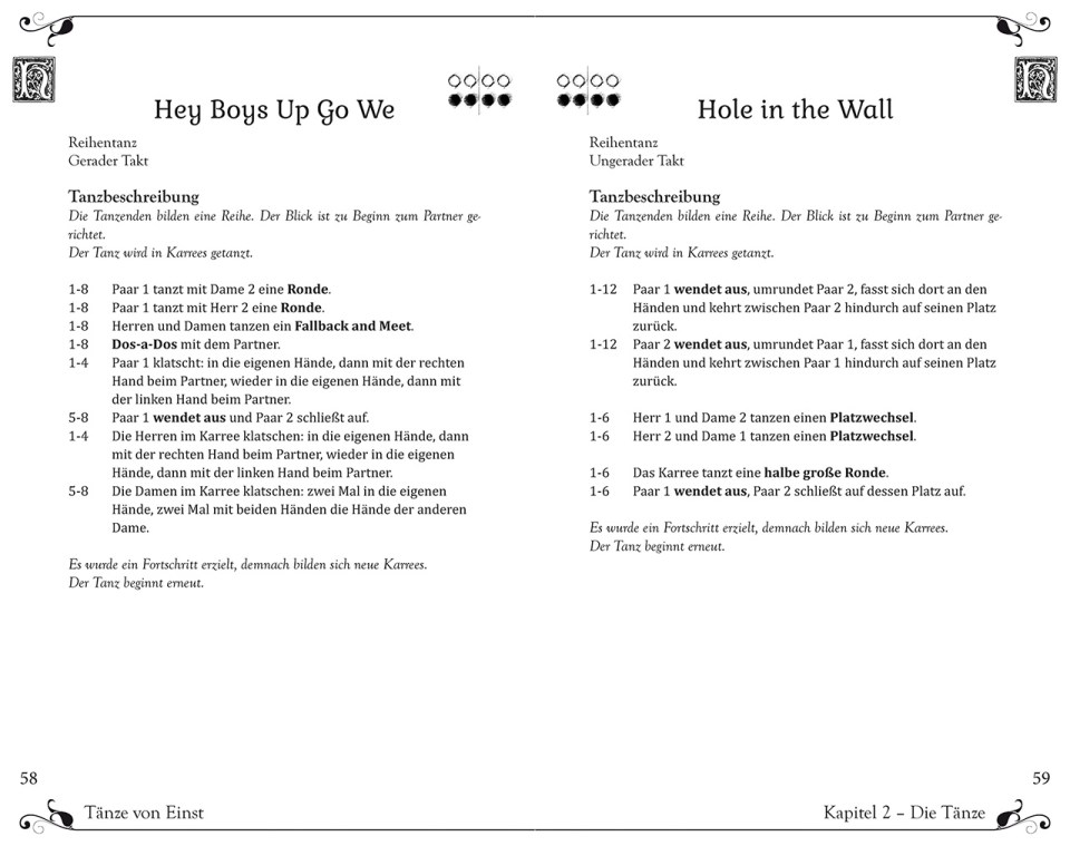 Das 116 Seiten starke Buch wechselt für neun Euro den Besitzer und bietet dann dafür die Beschreibungen von über 60 Tänzen feil. Es verzichtet bewusst auf ausschweifende Hintergründe zur Historizität der einzelnen Beiträge – ihr mögt euch erinnern, das ist quasi ein anderes Buch, das für ca. 2021 geplant ist –, sondern versucht vor allem, auf komprimiertem Raum dennoch verständliche Tanzbeschreibungen zu bieten.