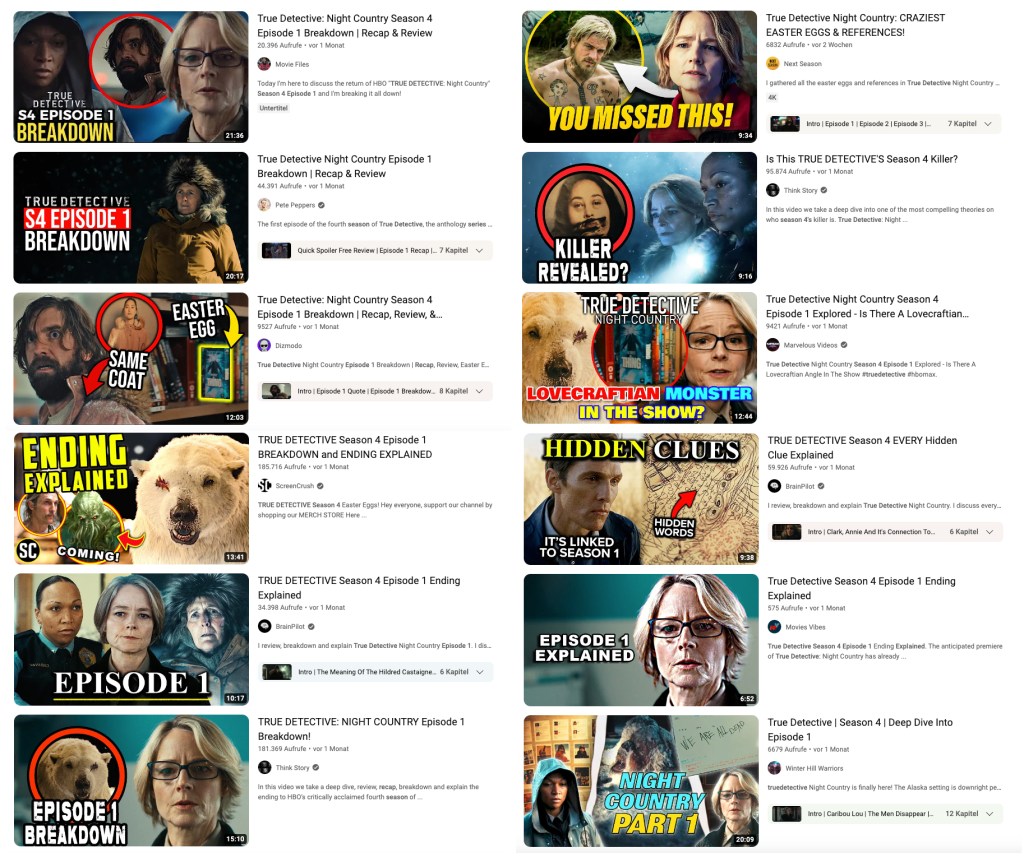 Dabei erwähne ich spezifisch Screencrush nicht mal, um gezielt auf denen herumzuhacken – die Grafik weiter oben im Artikel zeigt ja schon, dass deren Videos auch kein Einzelfall waren oder sind. Eine Serie wie True Detective ist nicht geschaffen, um gelöst zu werden. Insofern sind auch alle derartigen Ansätze, die in diesen Videos zu finden sind, von Anfang an zum Scheitern verurteilt gewesen.